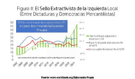 Tengámoslo claro, el regreso de la izquierda al poder enfatizó un estilo extractivista. El bloquearse la inversión, los beneficios quedaron en manos de una burocracia ineficaz y corrupta. Nuestros izquierdistas expropian y extraen todos los recursos que pueden (son extractivistas hasta la médula), pero, por su ideología, traban o corrompen todas las inversiones que pueden (ver Figura II) y luego nos hablan de la maldición de los recursos naturales.